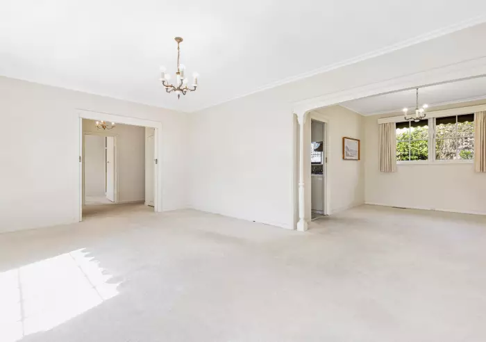 The lounge and dining areas wrap around the central kitchen and second meals zone, while the spacious main bathroom is complemented by a separate powder room. The laundry opens to another manicured garden space.