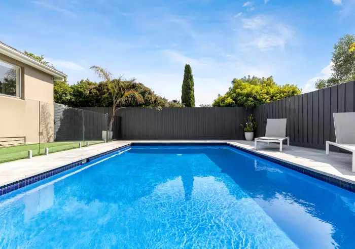 A pool-view bedroom features a built-in robe and a chic ensuite. The cleverly designed floor plan continues with a dedicated kids’ zone, offering two serene bedrooms with robes and a beautiful skylit bathroom featuring a freestanding bath, matte black tapware and high-end tiles.