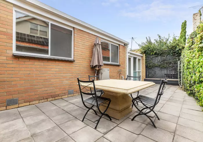 The sleek kitchen is equipped with modern appliances, a gas cooktop, ample cupboard space, and integrated laundry facilities. A flexible third bedroom can serve as a home office, or guest room, and opens out to a sun-drenched rear courtyard—perfect for relaxing or entertaining.