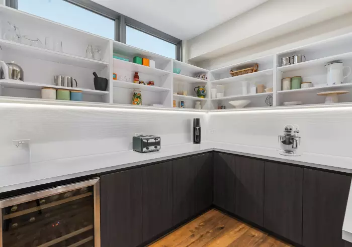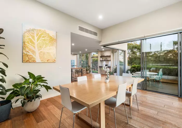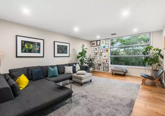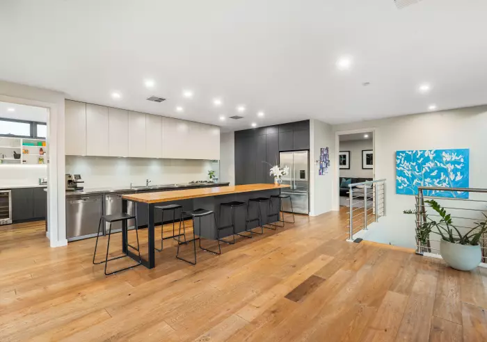 The upper level has been cleverly crafted to maximise the leafy outlook, featuring a spacious open-plan kitchen, living, and dining area that flows seamlessly through sliding doors to a private terrace—perfect for relaxed indoor-outdoor living.