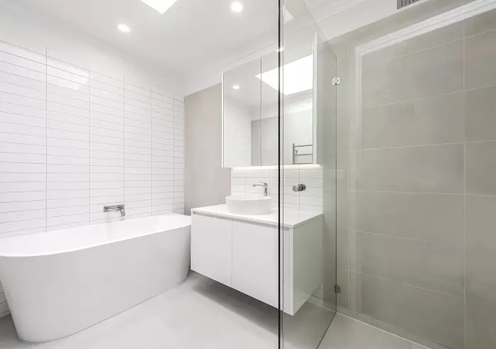 The luxurious bathroom includes a freestanding bath, premium tiling, stylish lighting, and skylights that fill the space with natural light.