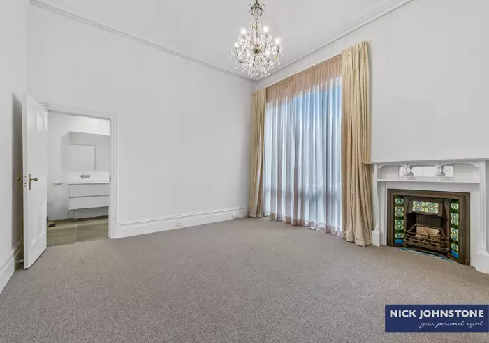 • A charming front office or sitting room with bay window, high ceilings, oak floors, and open fireplace