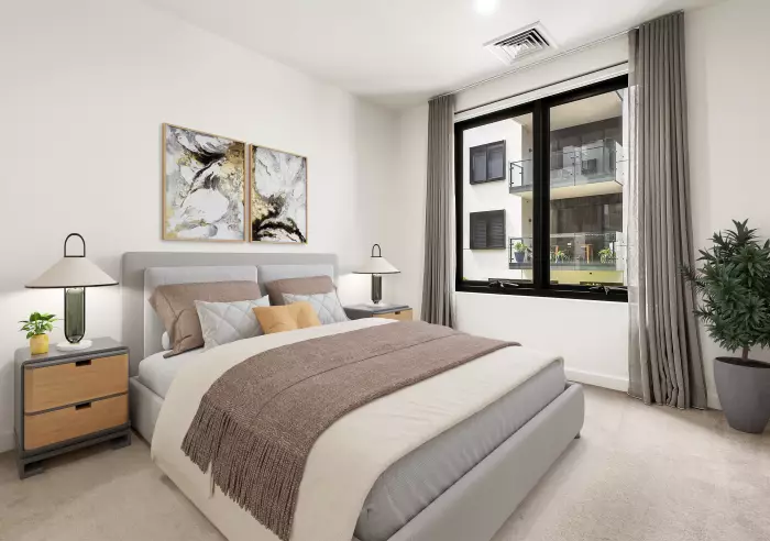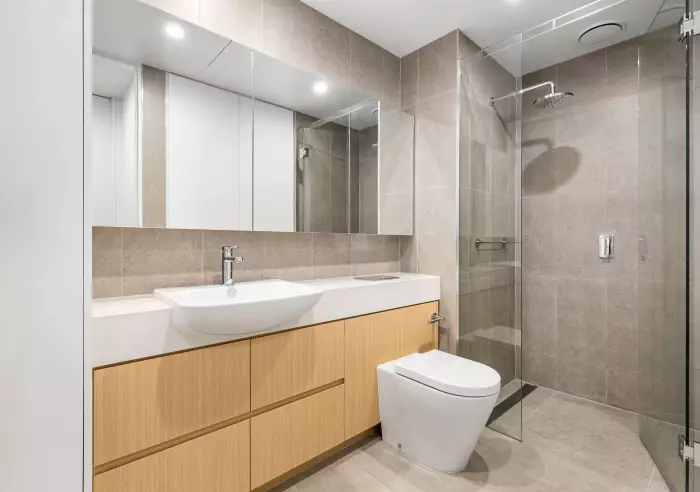 Built-in robes are a highlight of the well-sized bedroom which is serviced by a smartly-appointed bathroom with drenching rain shower and face-height mirrored storage.