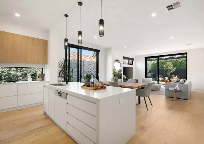 Nestled in a quietly elegant Bayside locale, this near new designer residence delivers a lifestyle of refined comfort and exceptional entertaining across two sun soaked levels. The striking architectural façade, pivot front door and wide engineered oak floors set a tone of sophistication from the moment you arrive.