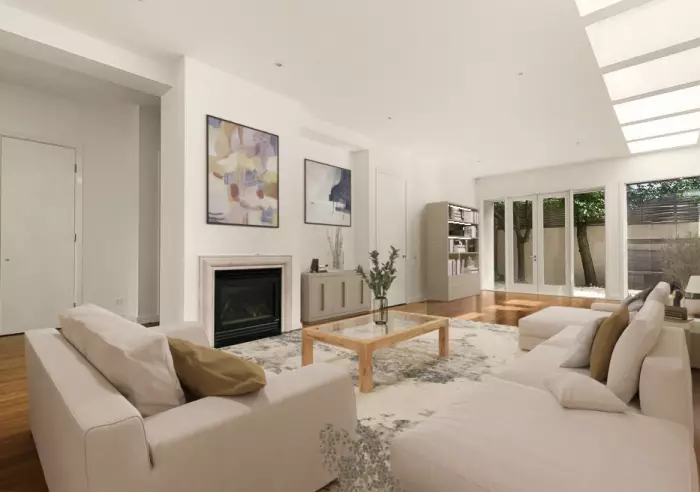 Step inside to a light-filled home showcasing high ceilings, polished timber floors, and generous proportions throughout. Designed for both relaxation and entertaining, the layout includes multiple living zones — from a formal lounge overlooking the private, paved rear terrace to a casual family area with a cozy gas fireplace and floor-to-ceiling glass doors that capture the afternoon sun.