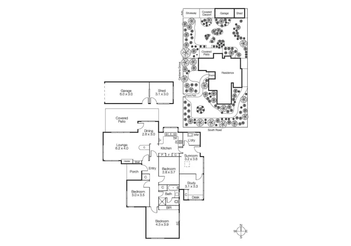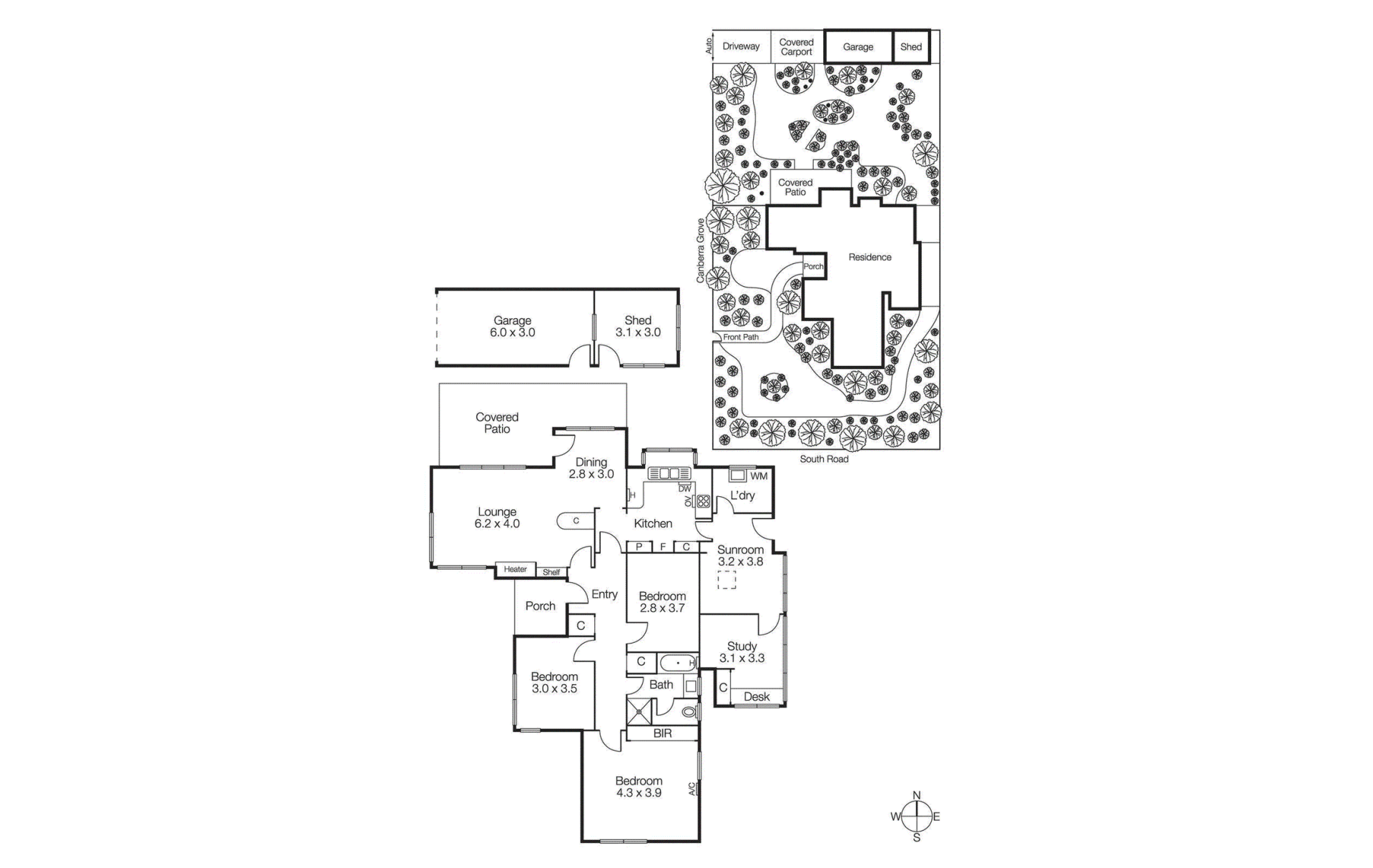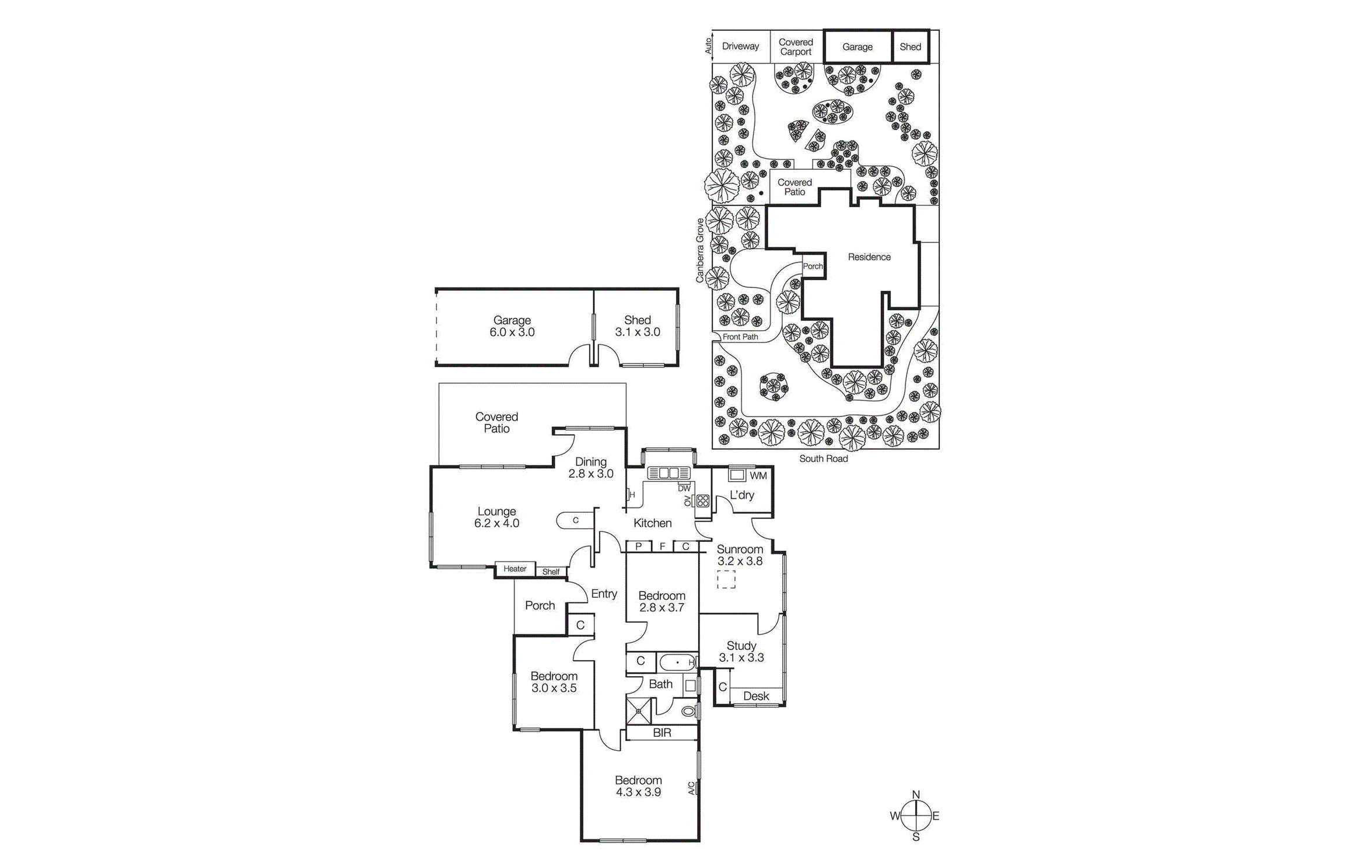 The existing 1950s home evokes a nostalgic charm, with sunlit living and dining (gas heating) opening to a north-facing patio. The original kitchen overlooks the leafy rear garden, while the sunroom and study welcome the morning light. Three bedrooms—including a main with robes and split system—are serviced by a classic retro bathroom. Additional features include an automated gated garage accessed from Canberra Grove.