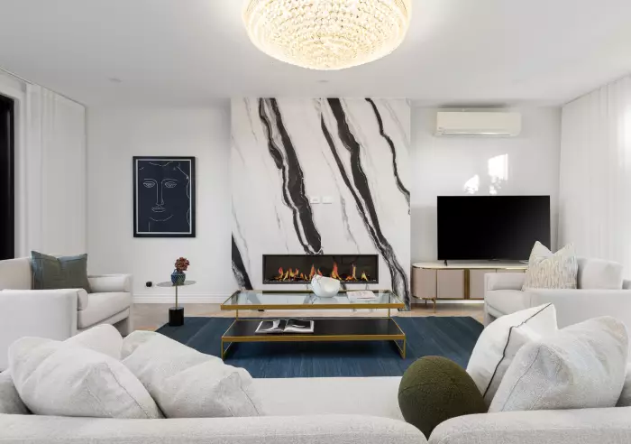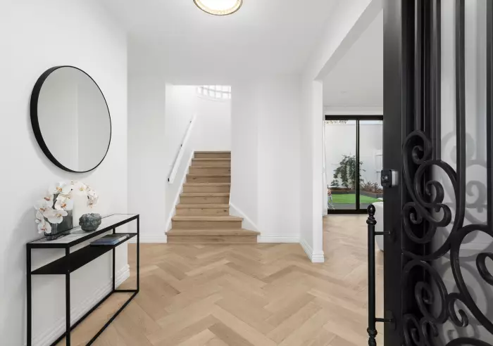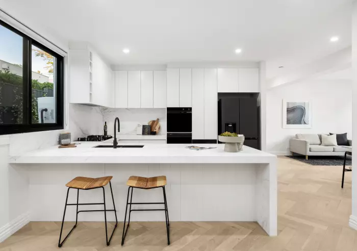 Beyond the elegant entrance, herringbone-laid oak floors introduce a cohesive interior palette. A formal lounge opens to a sun-drenched northerly deck and the faux-lawn rear garden, while the versatile dining and casual living zone is anchored by an exquisite marble kitchen featuring thick luxe benchtops, premium appliances including double ovens, and an integrated Miele dishwasher. A wall of retractable glass blurs the line between indoors and out, extending the living space to the main alfresco deck with views across the striking walled garden.