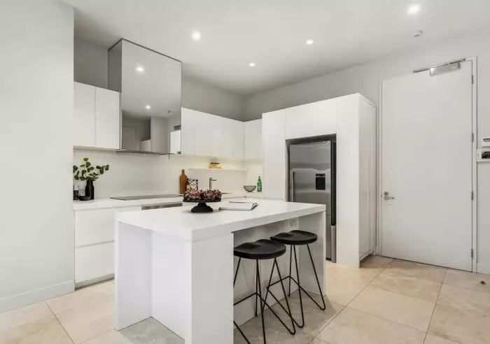 This oversized apartment offers views across Brighton’s rooftops to the bay and city skyline. Floor-to-ceiling windows, soaring 3m ceilings and elegant marble finishes create a refined and spacious living environment.  The open-plan living and dining area flows to a generous private terrace, ideal for entertaining or relaxing at sunset. The kitchen features Stone bench tops, island bench, Miele appliances,ample storage and fridge.