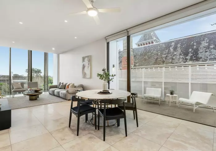 Two bedrooms each include mirrored built-in robes and deluxe marble bathrooms with underfloor heating. Additional features include a concealed study area, European laundry, automatic blinds, climate control, plush wool carpets, two secure basement car spaces and storage locker.
