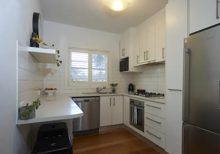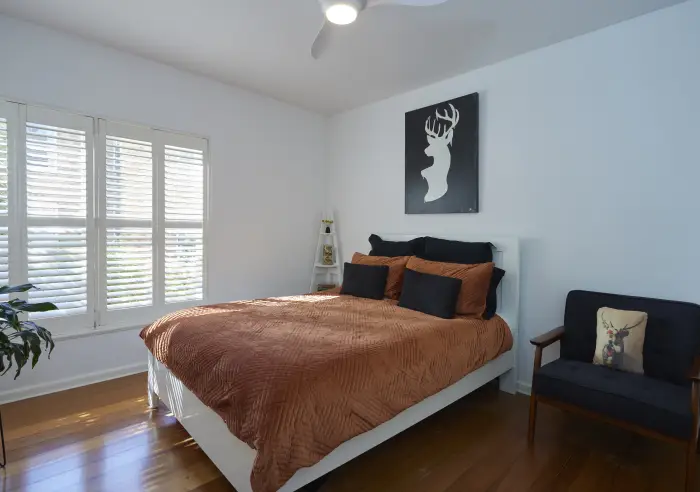 The light-filled interior features polished hardwood floors, a well-appointed kitchen with breakfast bar and stainless-steel appliances, and a comfortable living area with leafy garden outlooks through plantation shutters.