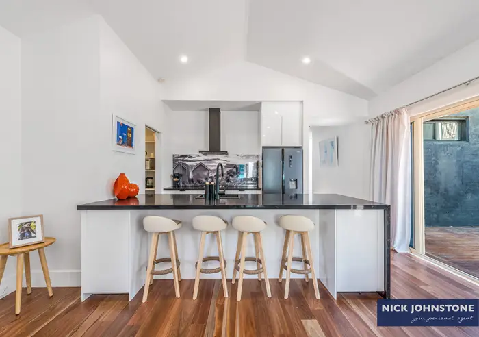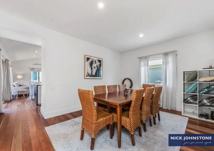 Light-filled open-plan living with high-pitched ceilings flows into a brand-new stone-topped kitchen with island bench, stainless steel appliances and butler’s pantry. A separate space set up with a dining table offers excellent flexibility as a formal dining area or home office.