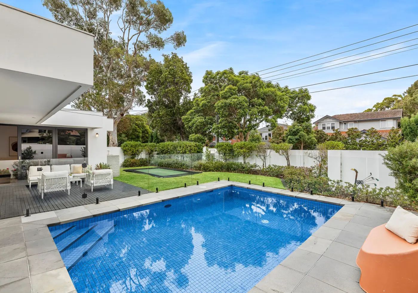 The indulgent master suite features a luxurious ensuite and a fully fitted double-sided walk-through robe designed with both style and practicality in mind. Two additional king-sized bedrooms include built-in robes and are filled with natural light thanks to striking floor-to-ceiling windows. A second ensuite services bedroom two, while the central bathroom impresses with a walk-in shower and statement stone bath. Cleverly designed, the floorplan provides multiple living areas, each with garden outlooks and direct access to expansive decking.
