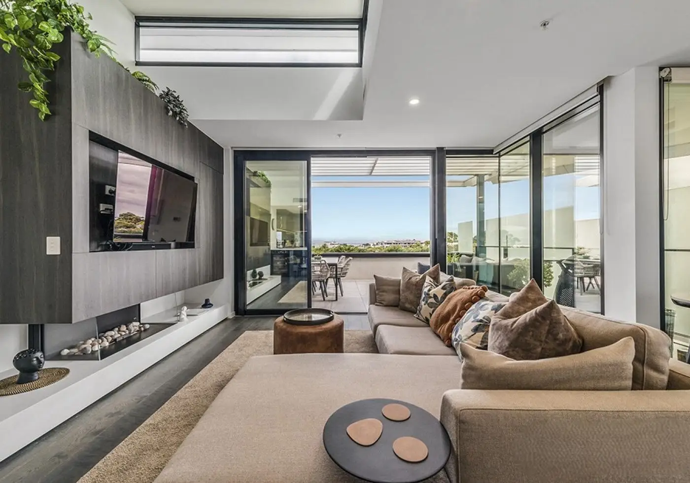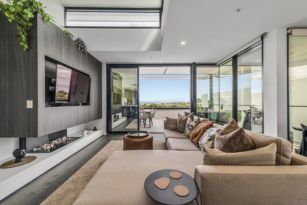 Sun-drenched open-plan living and dining areas are framed by soaring ceilings, rich timber flooring and a gas fireplace, flowing seamlessly to a private, expansive terrace — the perfect setting to unwind while enjoying elevated views toward the bay.