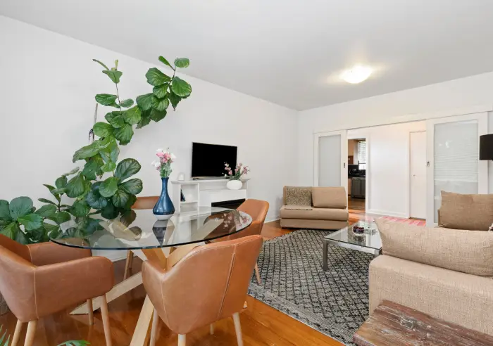Privately tucked at the rear of a beautifully maintained boutique 1960s group, the apartment showcases the enduring quality and scale of its era. A previous renovation has thoughtfully enhanced the interiors, delivering effortless modern functionality while preserving the home’s spacious character.
