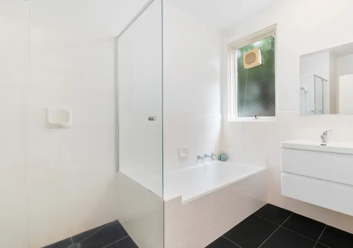 Accommodation comprises two double bedrooms, each fitted with built-in robes, serviced by a well-appointed bathroom featuring a bath, floating vanity, integrated laundry facilities and a separate toilet for added convenience.
