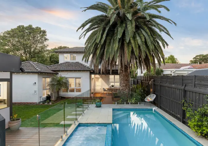 Stepping down to the main family zone, French doors open to a covered merbau deck overlooking the resort-style backyard. Here, a Canary Island date palm frames the gas and solar-heated pool and spa, complemented by bluestone surrounds, an outdoor shower, and a versatile pool house/studio.