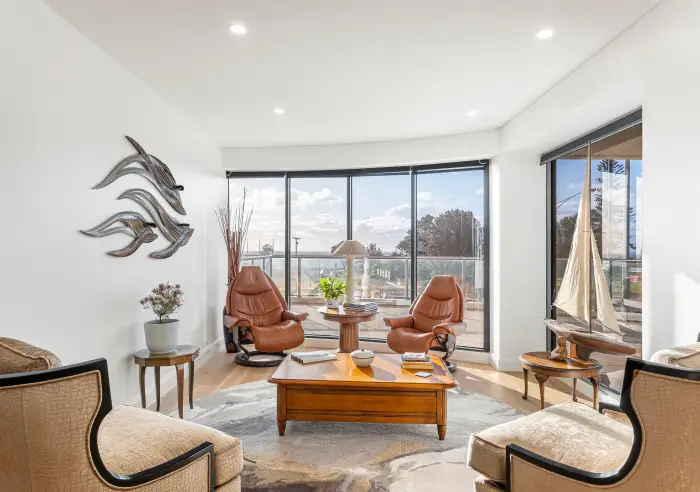 Accommodation is flexible, with three additional bedrooms—two opening onto a sunlit north-facing balcony—and a third configured as a home office or optional fourth bedroom. A secondary living zone provides valuable separation, complete with its own kitchenette/bar, making it an ideal space for guests or relaxed family living.