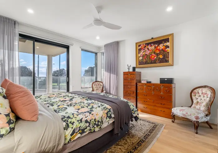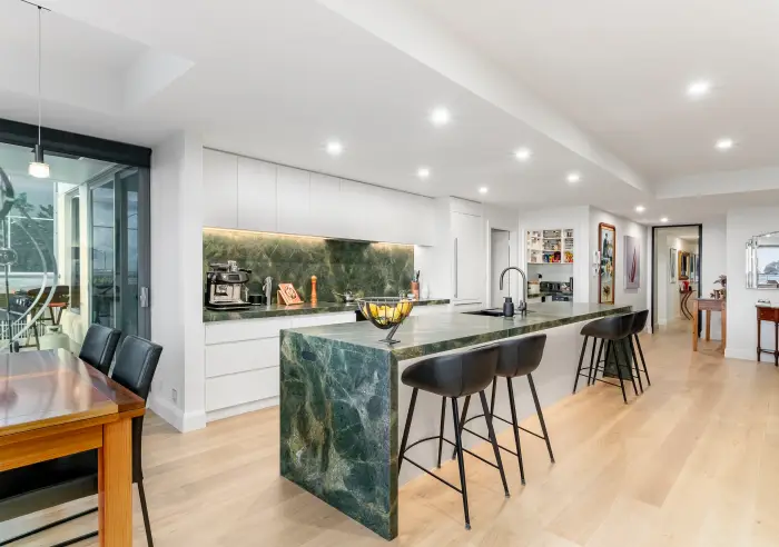 The main suite is a private sanctuary, positioned to capture tranquil bay views and direct terrace access. It features custom joinery, a generous walk-in robe and a beautifully appointed ensuite with dual vanities and heated towel rail. Two bathrooms have been thoughtfully redesigned with terrazzo finishes, granite detailing and double rain showers, while a separate powder room and well-appointed laundry continue the home’s cohesive, high-end aesthetic.