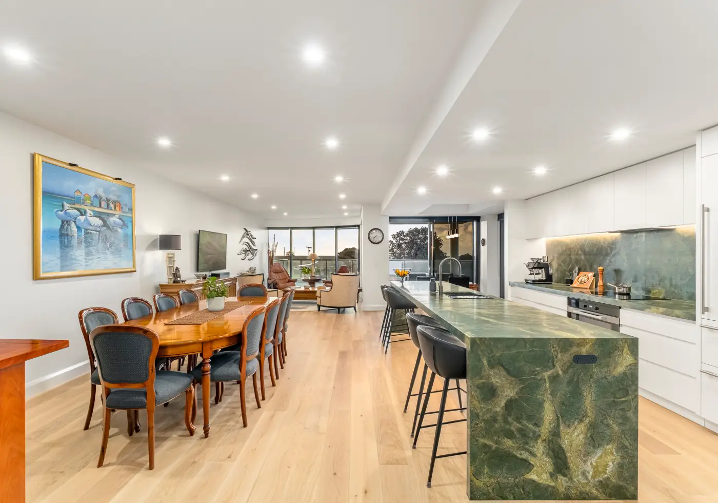 Arriving via lift to a private, elegant entry, the home immediately reveals its most compelling feature—water views that unfold the moment you step inside. Expansive open-plan living and dining areas extend effortlessly to a deep terrace, creating a seamless indoor-outdoor connection ideal for entertaining, from leisurely afternoons to sunset drinks overlooking the horizon.